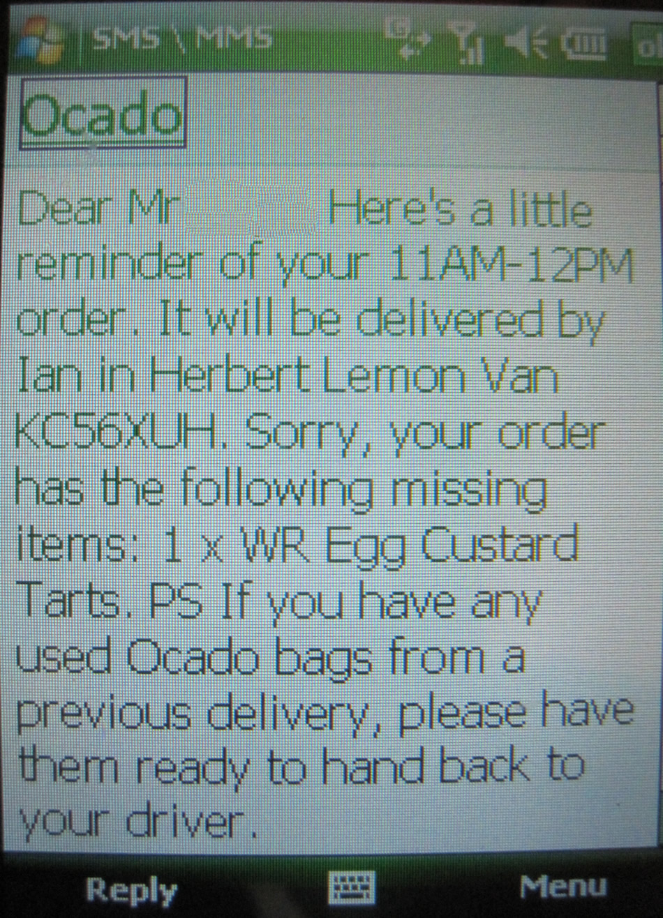 ocado-smsAnyway, I was sad before my delivery arrived as Ocado had already sent me a SMS alert to remind me of my delivery slot and to inform me that the 2 egg custard tarts I had ordered were unavailable.  Bummer! I was looking forward to settling down to watch a movie while I gorged on them with a cup of tea…C’est la vie!